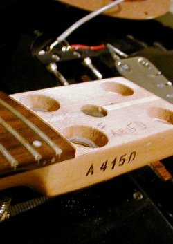 Seen at the upper right is the backside of the guitars scratchplate, showing the potentiometers and wiring. The number