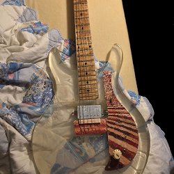 At left, what I call the Dan Armstrong Thompson guitar as it has so many holes in the acrylic body it looks like someone used it for target practice